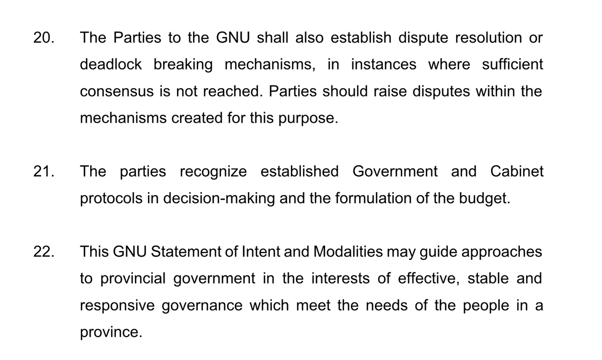 2. The agreement reads like its sole focus is on the appointment of Ministers. Vague requirements are included of alignment with the founding values of the Constitution. That is all well and good. It also commits alignment to the Bill of Rights. Lovely.
