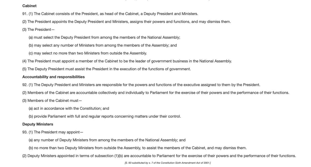 12. Great. Scene set, framework of analysis set. To start, who makes up the executive? That is, who runs South Africa on a day-to-day basis? Who delivers services, etc.? The President, Ministers, and Deputy Ministers. Nobody else.