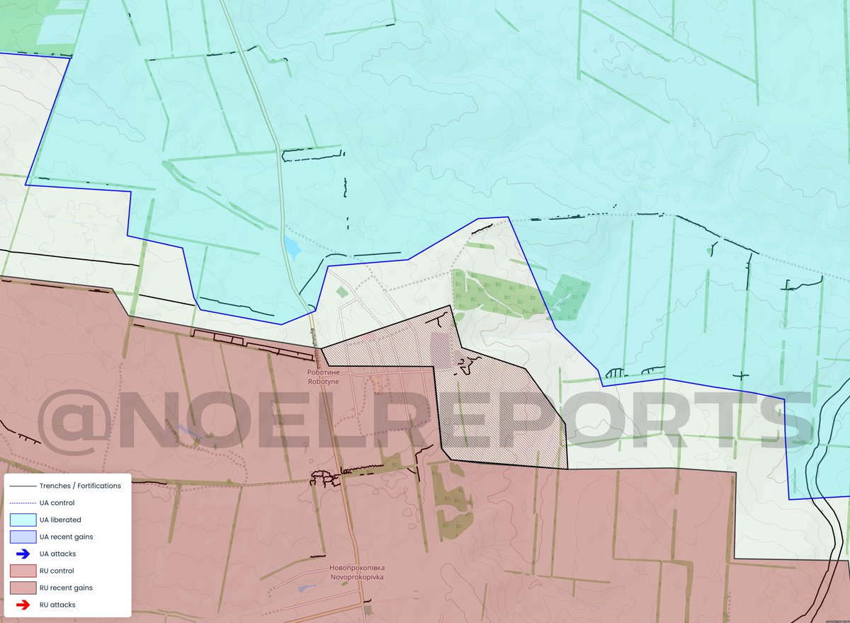 Robotyne. Geolocated footage shows Russian attacks northeast of Robotyne towards a trenchnetwork held by Ukrainian forces. I am quite confident that Robotyne itself is now mostly Russian controlled with a few streets in a gray zone over which Ukraine has firecontrol.