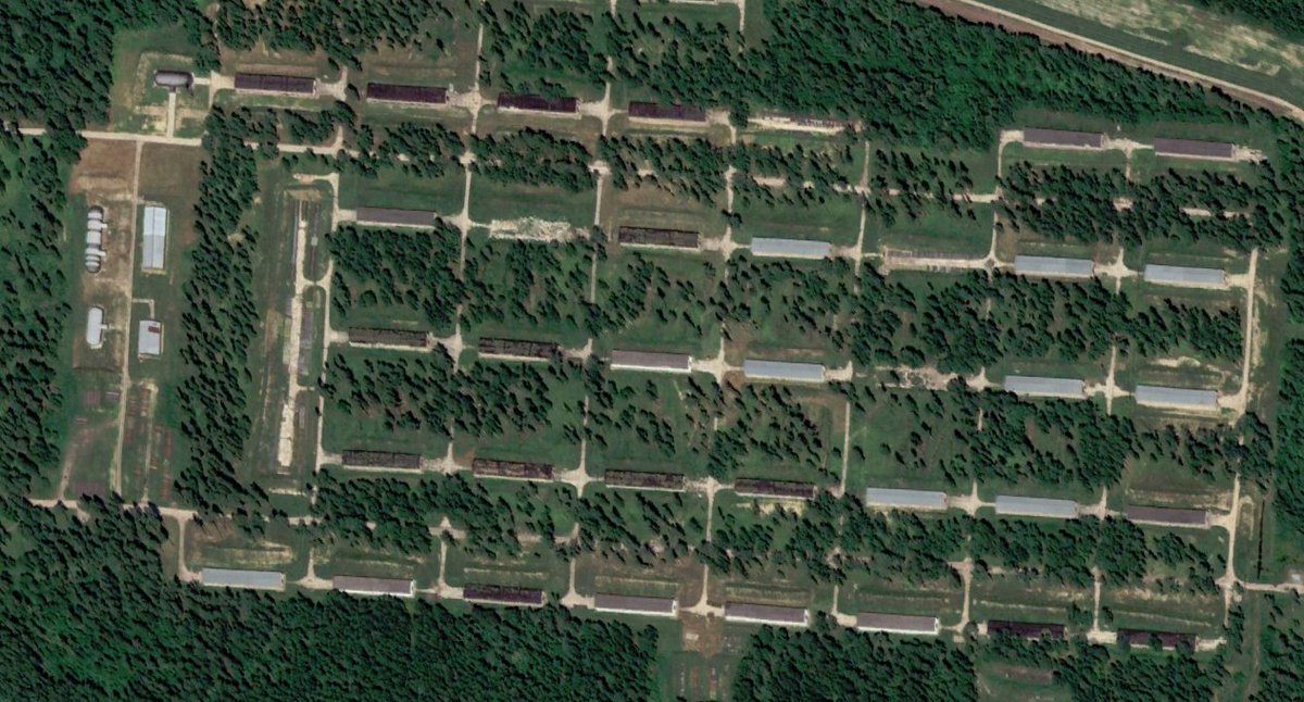 The base consists mostly of dispersed garages that should store artillery ammunition and equipment. But there are three small clusters of vehicles that are being stored there since 2020. earth.google.com/web/@52.512681…