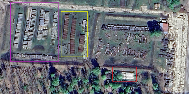 5/9 In the lower half, I'm not certain about the actual ID of the contents but the lengths of the larger objects are ~6m (violet) and ~10m (red) long. Additionally in between the recordings another size of boxes was added ~6,5m (yellow) in length. Maybe from one of the buildings.