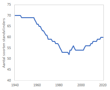 The most simple way is the number of native butterfly species. In 1946 the first species got extinct: the Purple-edged copper (L hippothoe). Once in a while a specimen is seen in the SE, dispersing from the German or Belgian populations, but they never established anymore. 2/11
