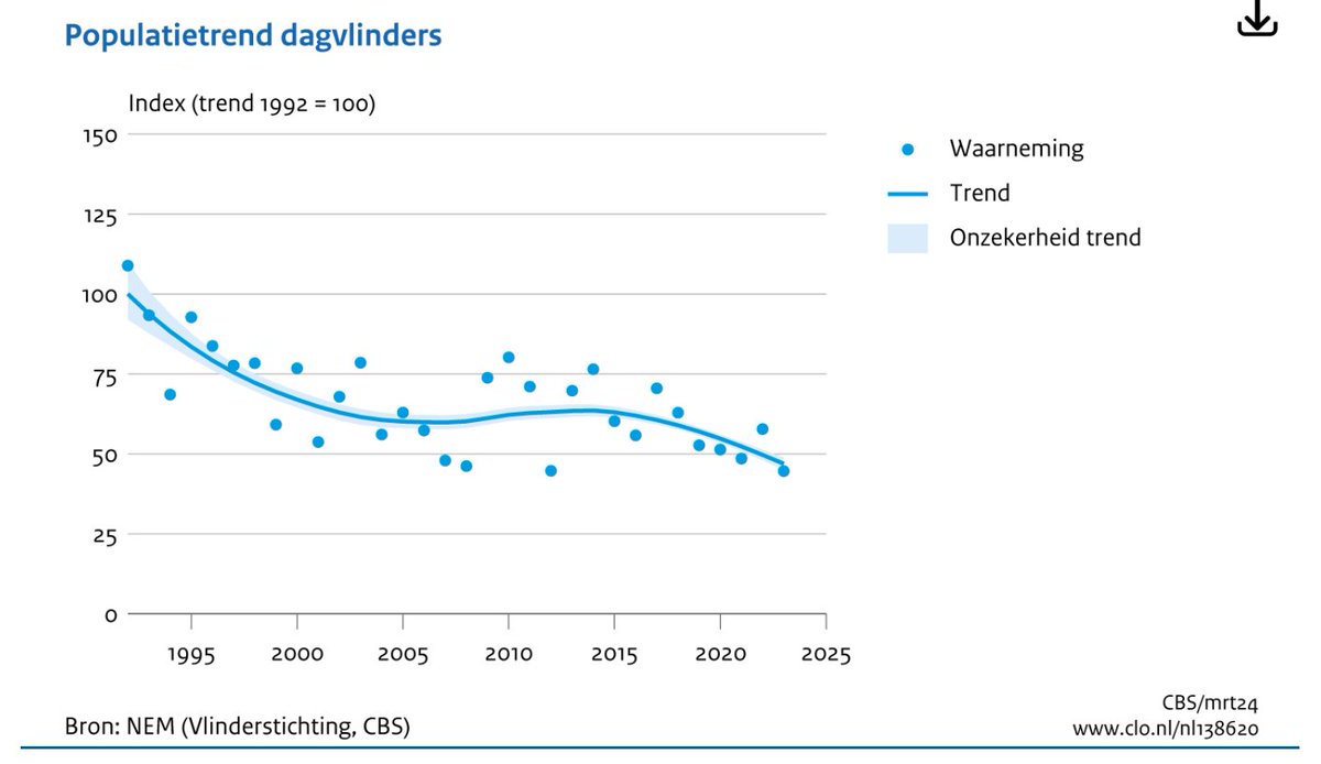 De metingen laten een achteruitgang van meer dan 50% zien (). 2023 was het slechtste jaar voor vlinders sinds meer dan dertig jaar. 7/ cbs.nl/nl-nl/nieuws/2…