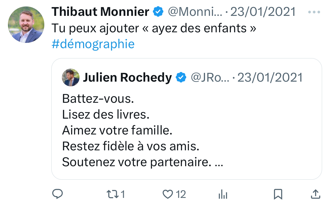 Régulièrement, il exprime une motivation particulière à la paternité : celle de la démographie. [3/15]