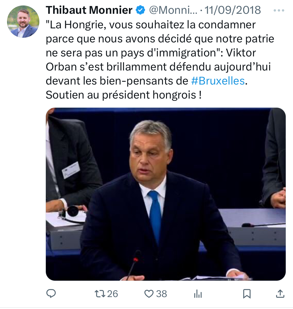 Cette même année, il apporte aussi son soutien à deux autres présidents d’extrême-droite : Bolsonaro et Orban. Il posera d'ailleurs fièrement aux bras de ce dernier trois ans plus tard. [5/15]