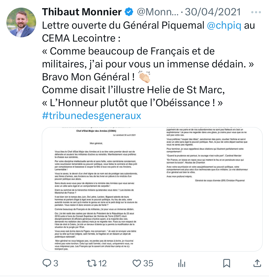 En 2021, il apporte son plein soutien à la tribune des généraux factieux annonçant pourtant la guerre civile en France et la reprise du pouvoir par les militaires. [9/15]
