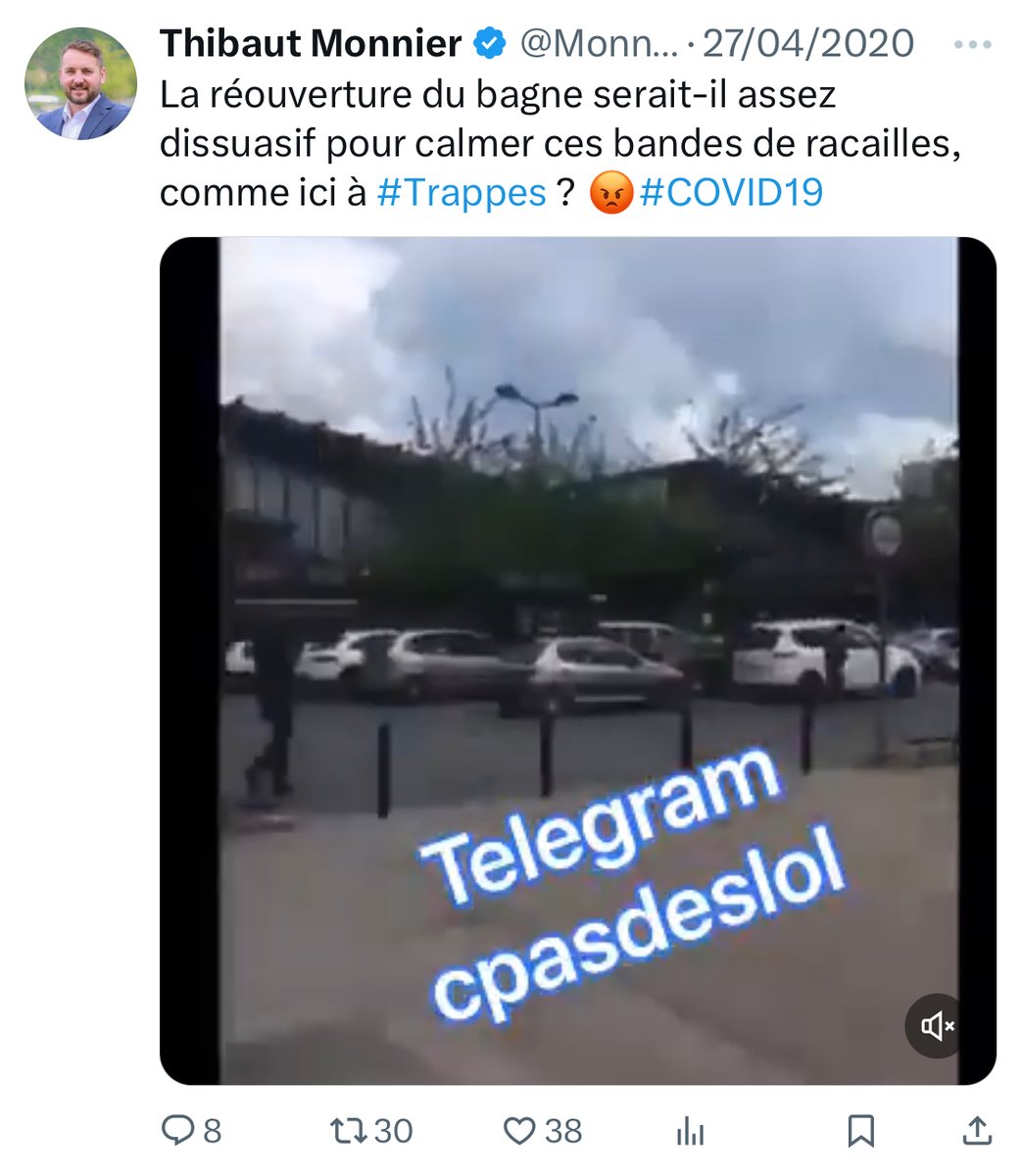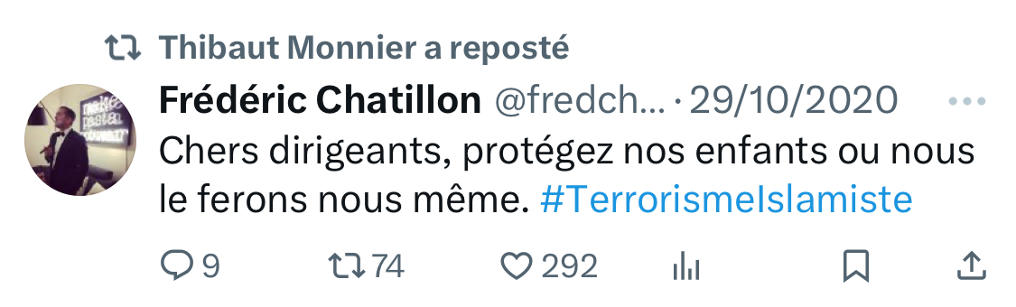 En 2020 il retweet un message de Frédéric Chatillon, président du groupe d’ultra-droite violent le GUD. Ce tweet appelle les français à se faire justice eux-mêmes. Il se déclare aussi favorable à la réouverture du bagne. [7/15]
