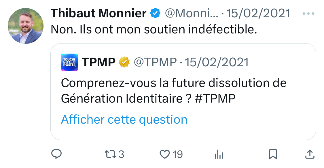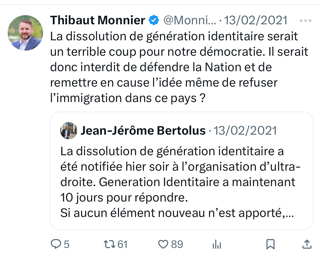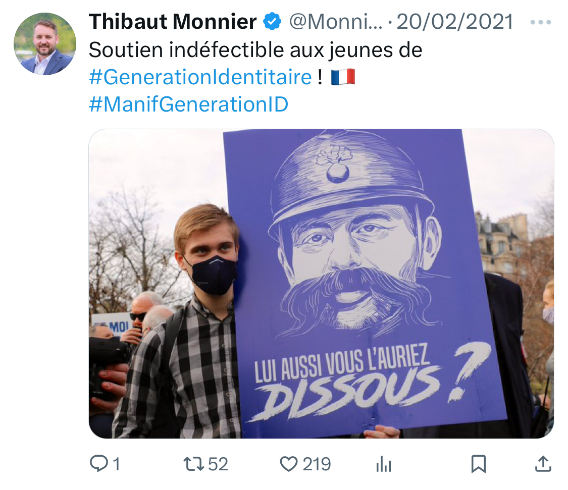 Toujours en 2021, il s’insurge contre la dissolution par le ministère de l’intérieur du groupe violent et suprémaciste Génération Identitaire. [10/15]
