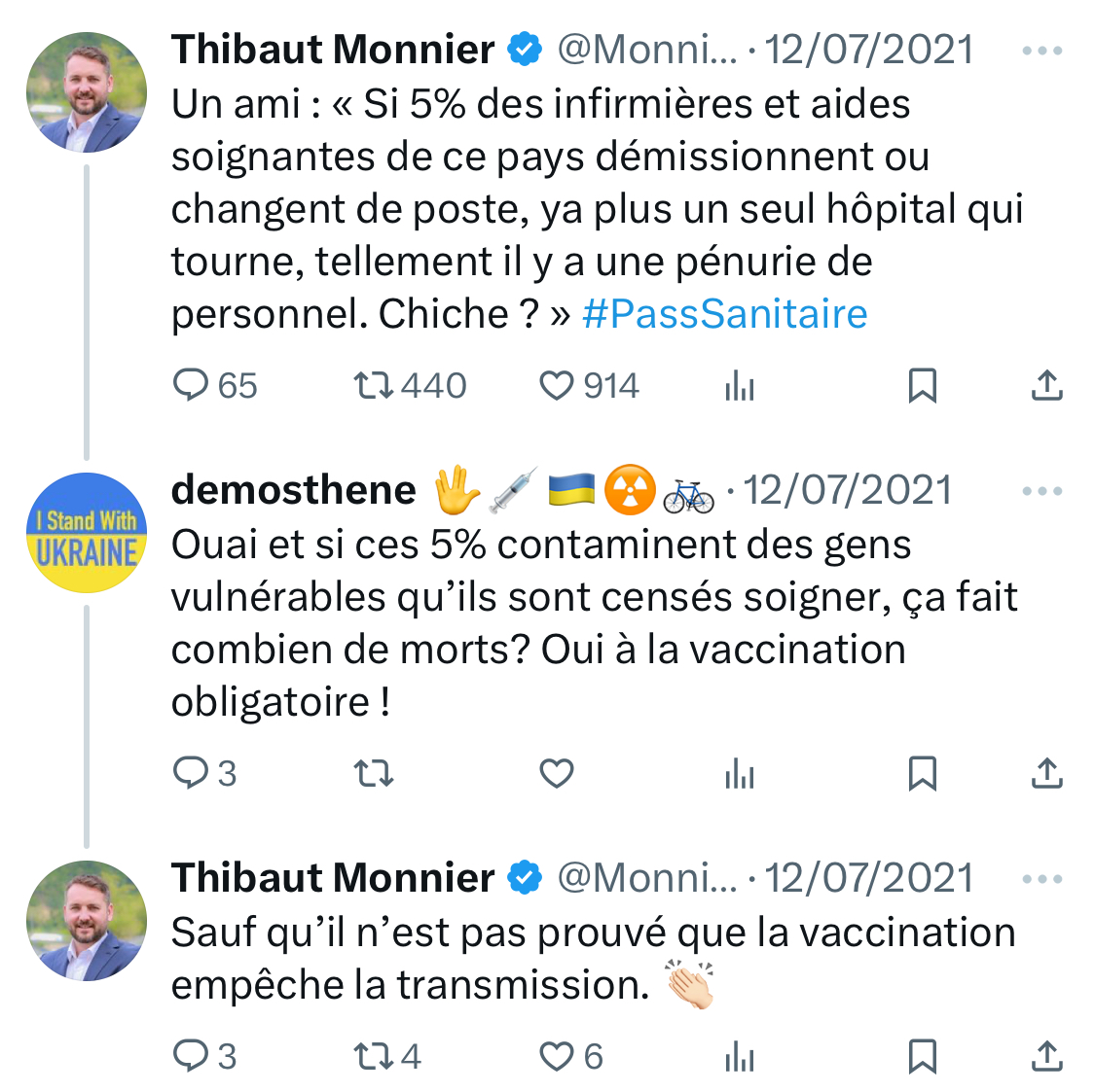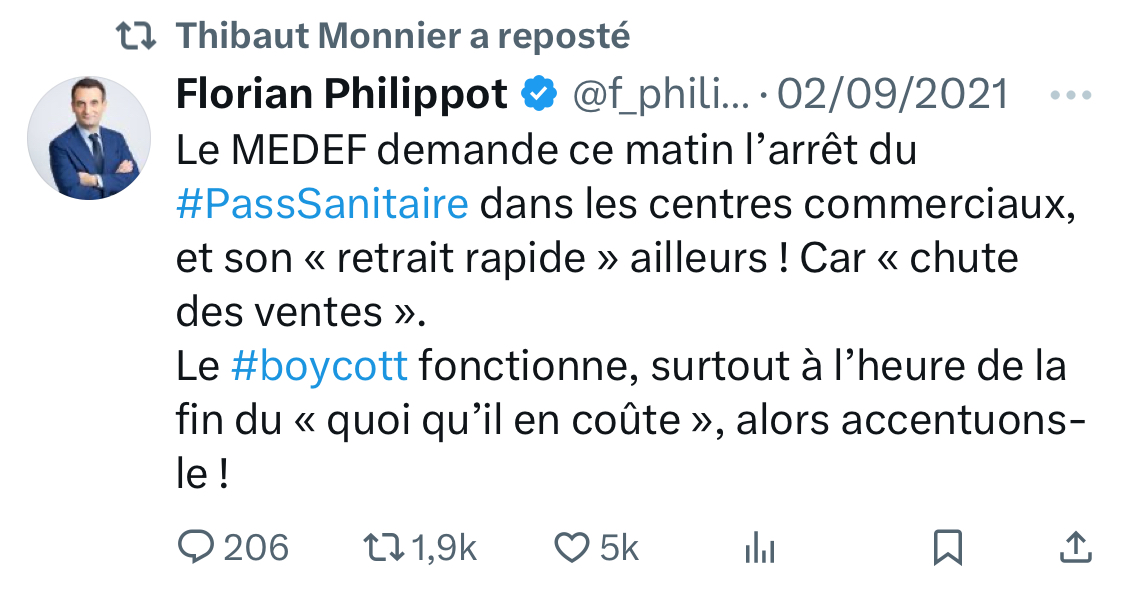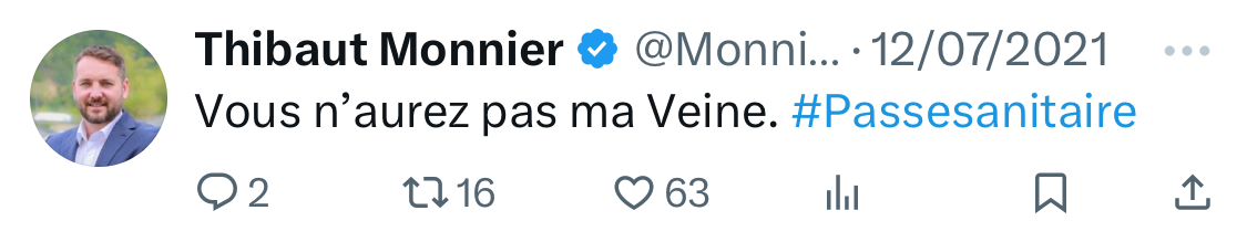 Il relaie le hashtag #DictatureSanitaire et s’oppose au passeport sanitaire. [13/15]