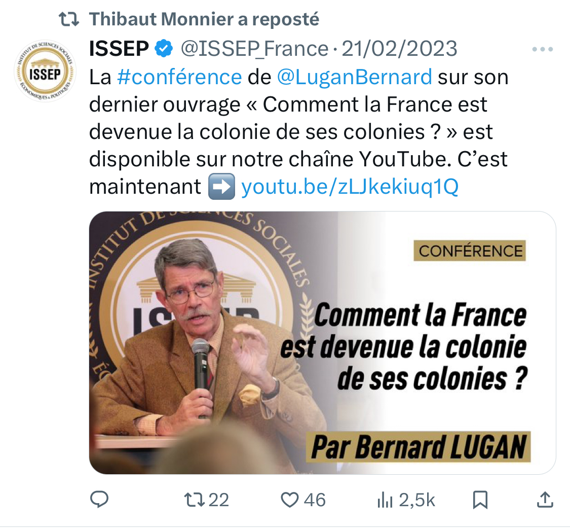 Bernard Lugan est un historien racialiste, colonialiste, avocat de l'apartheid et négationniste du génocide rwandais. Il défend la notion de race et "l'idée d'une infériorité naturelle des habitants du continent africain." [15/15]