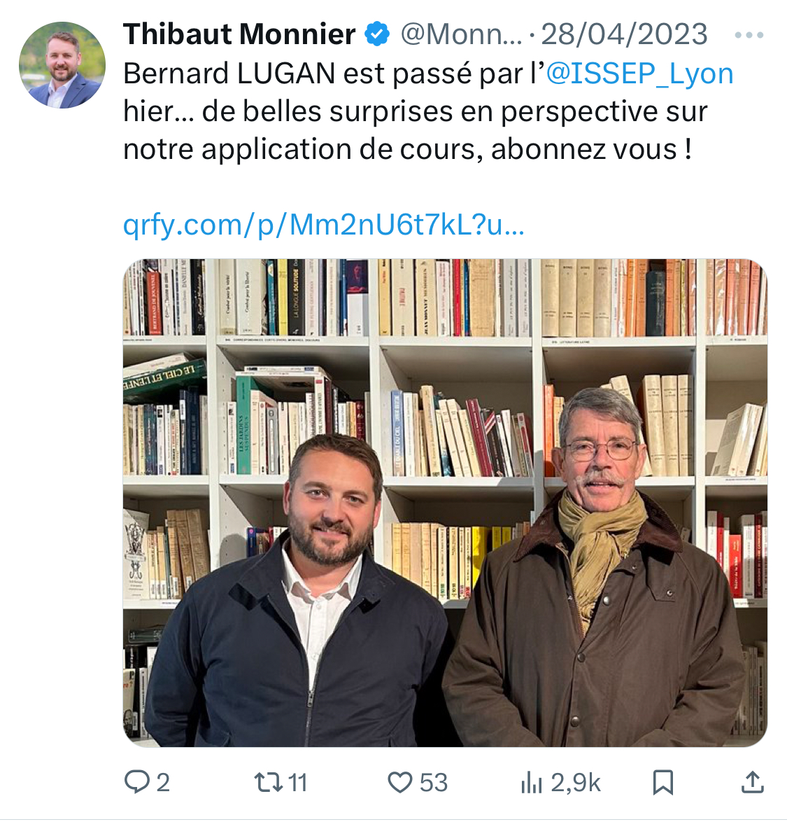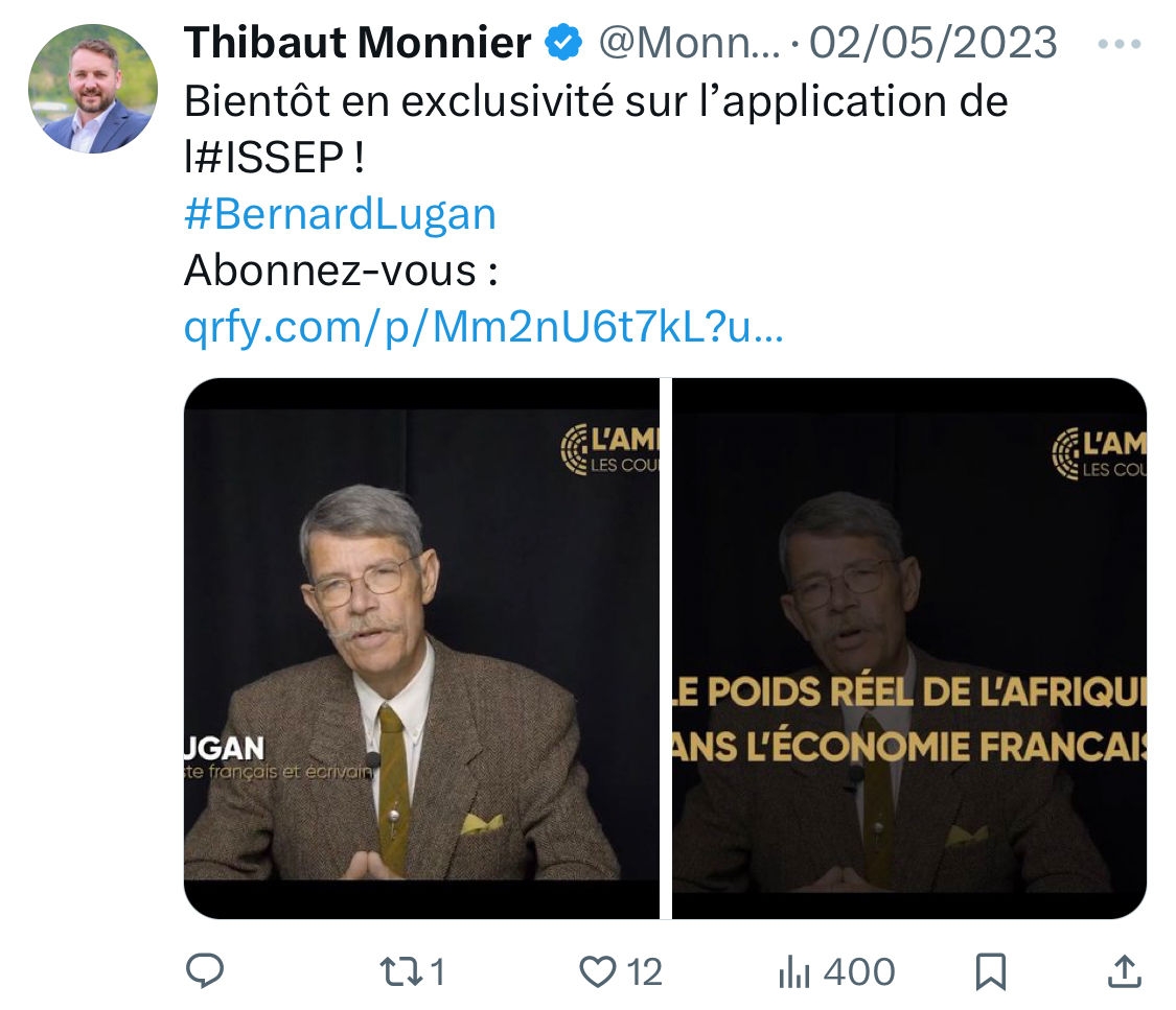 En février, en avril et en mai 2023, il diffuse à de nombreuses reprises des messages, des photos et des vidéos pour promouvoir le "passionnant" Bernard Lugan. [14/15]
