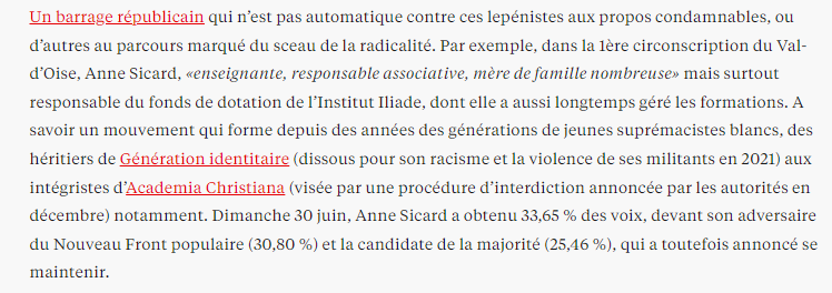Anne Sicard a très récemment nettoyé ses réseaux sociaux. Mais on sait qu'elle est responsable du fonds de dotation de l’Institut Iliade, dont elle a aussi longtemps géré les formations. Extraits de Libération. [2/8] liberation.fr/politique/mess…