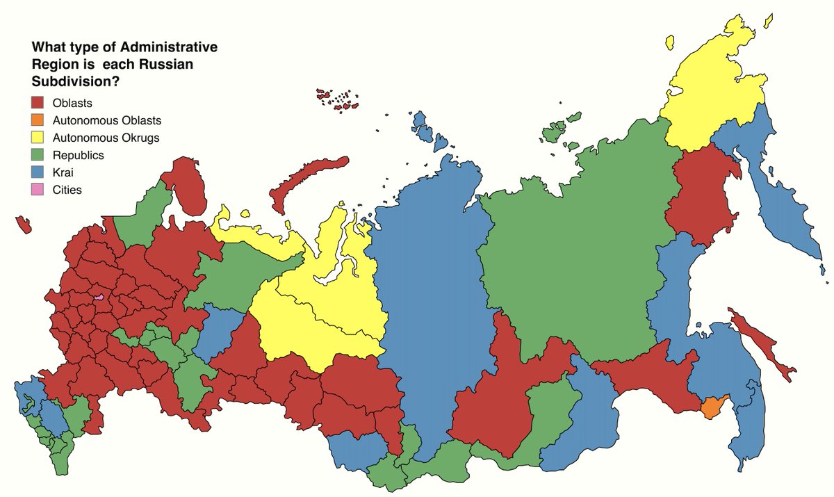 El territorio ruso se divide en repúblicas, oblasts, oblasts autónomos, Krais, Okrugs, distritos federales y ciudades federales. Ahora te explico que es cada uno. (2/10)