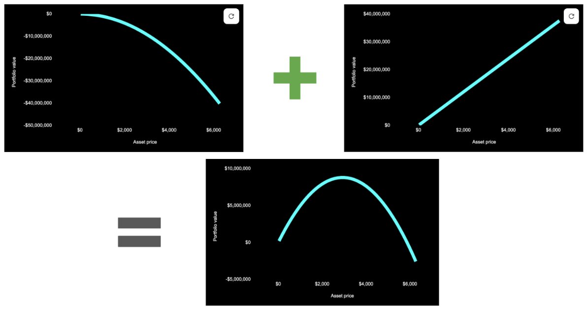 Crab is made by selling a 2-perpetual (Squeeth) and buying a 1-perpetual (a normal perp). The combination gives a downward bending payoff with a maximum at the current price.