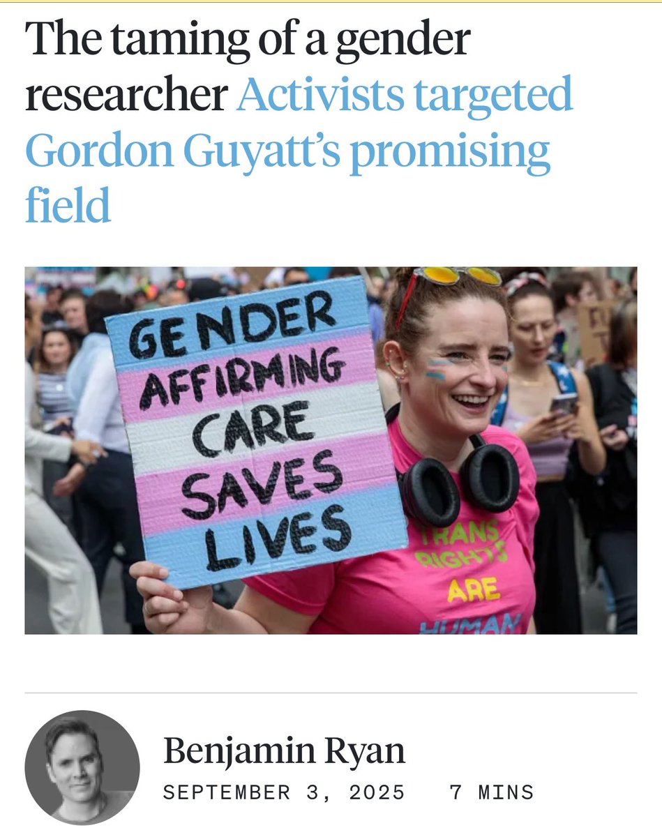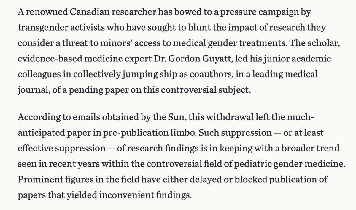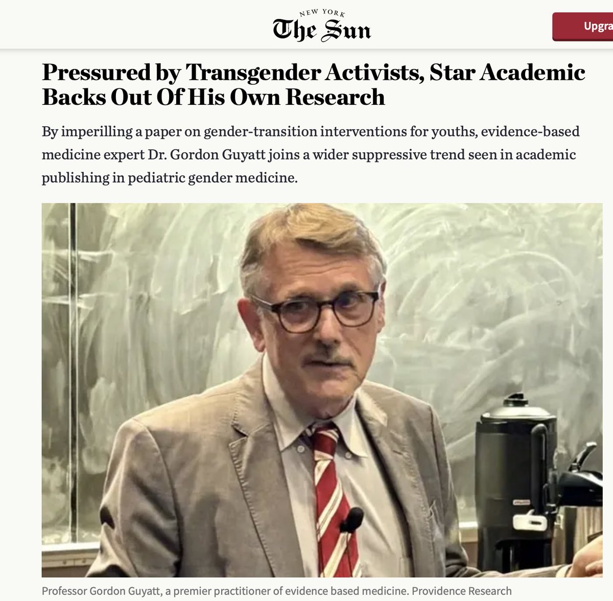 I report for @NewYorkSun: By imperiling a paper on gender-transition interventions for youths, evidence-based medicine expert Dr. Gordon Guyatt joins a wider suppressive trend seen in academic publishing in pediatric gender medicine.