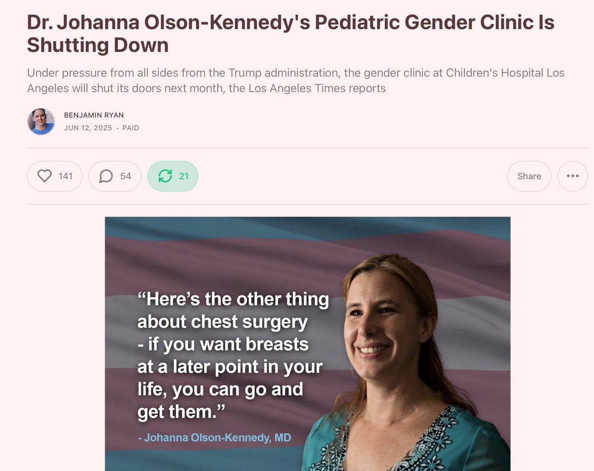 The blue-state pediatric gender clinic closures started with Children's Hospital Los Angeles last July and have continued steadily since then. benryan.substack.com/p/dr-johanna-o…