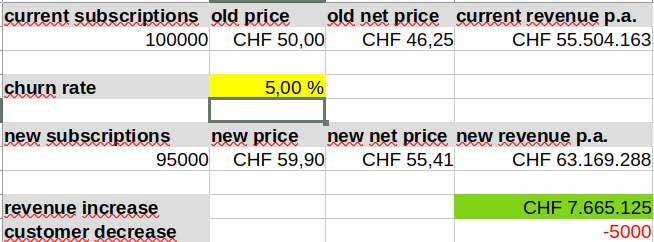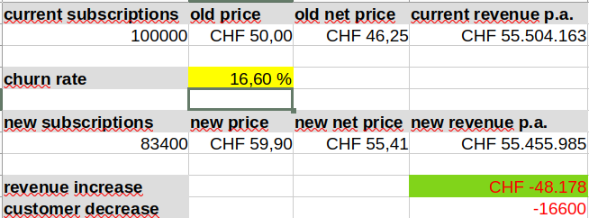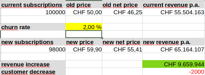 Natürlich ist eine Preiserhöhung immer mit einem Kundenverlust «Churn» verbunden, das wissen die Excel-Sheet-Productmanager von Swisscom natürlich.