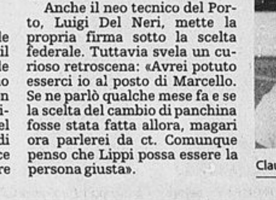 Gigi Del Neri ci dice che ci poteva essere lui al posto di Lippi. Comunque non gli è andata male allenerà i campioni d'Europa del Porto....per tipo quindici minuti ma vabbè.
