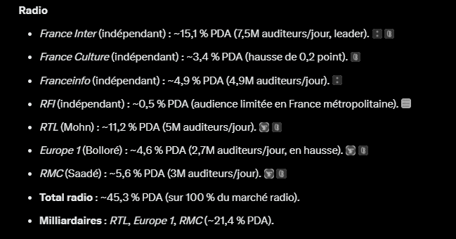Donc le 80% ne parle pas du nombre de titres, ni de stations, ni de fréquences, mais de leur audience. Et exclut, tenez vous bien, les media publics et la PQR du calcul.