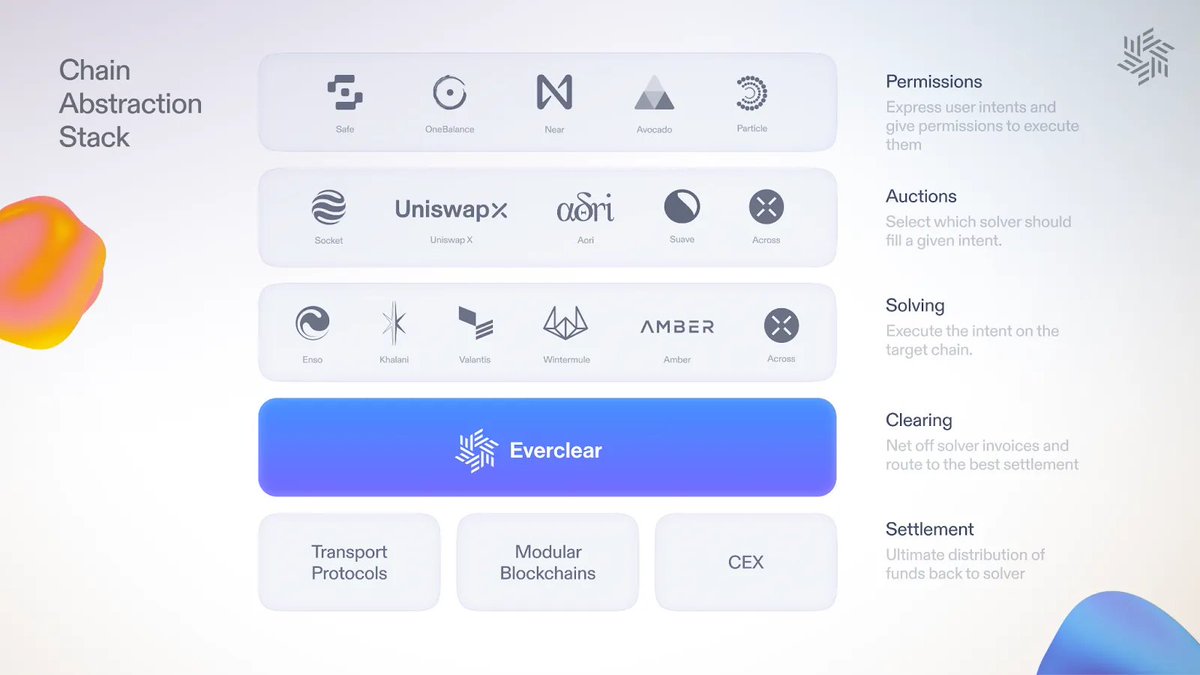 Key layers of the Chain Abstraction Stack are Permissions, Auctions, Solvers, and Clearing.