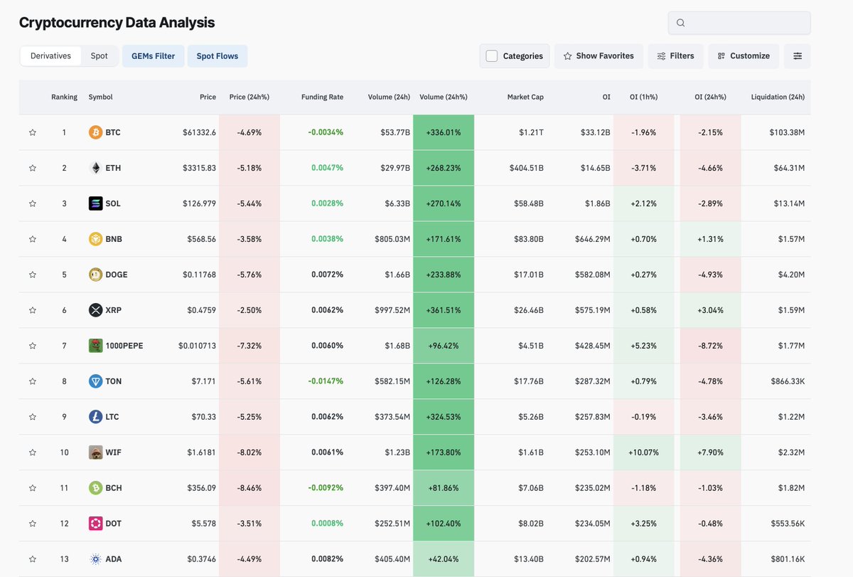 • Track volumes, open interest, funding rates, and liquidations and filter by categories and other parameters