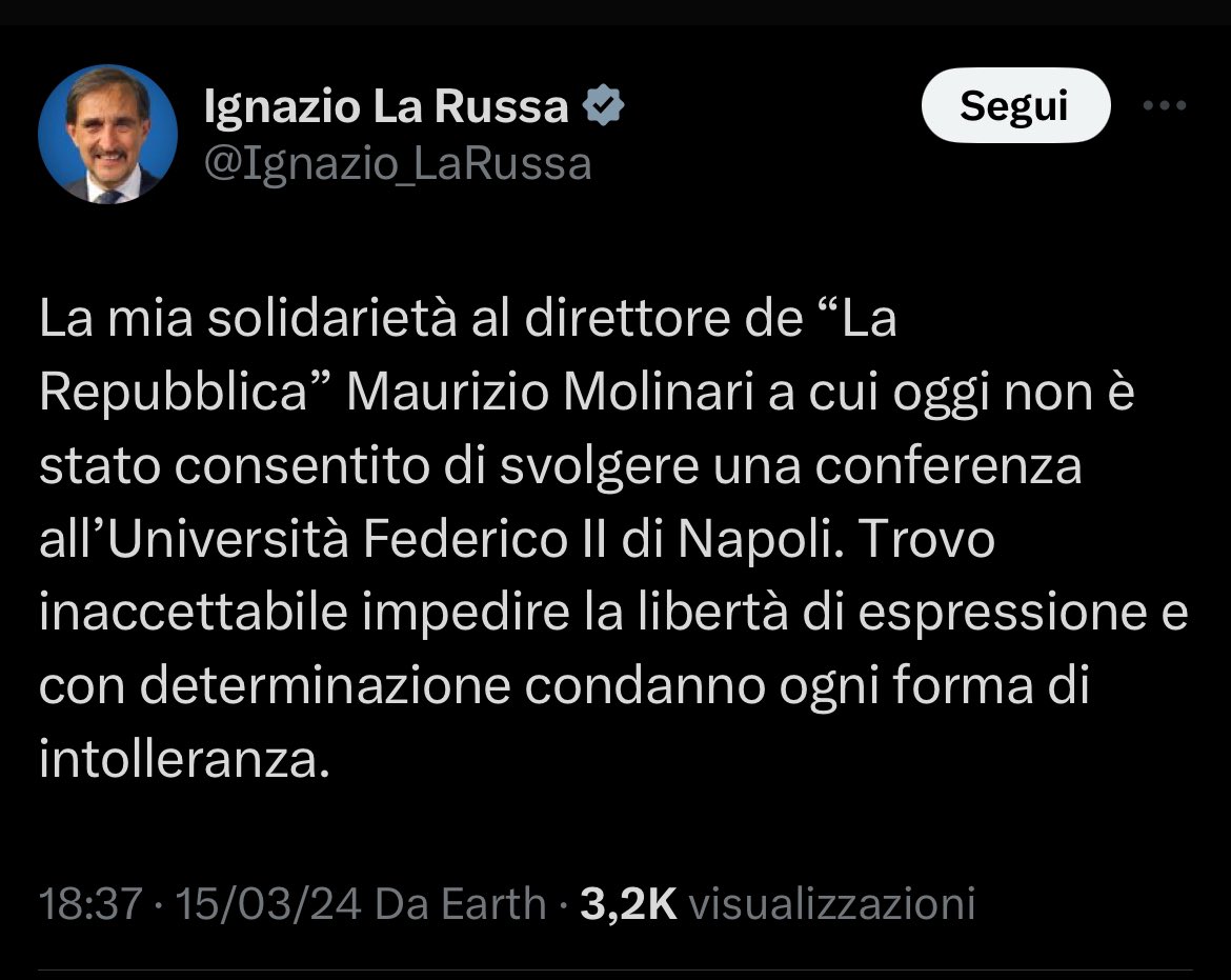 Iniziamo col pacato Ignazio, paladino da tempi molto sospetti della “libertà di espressione”.