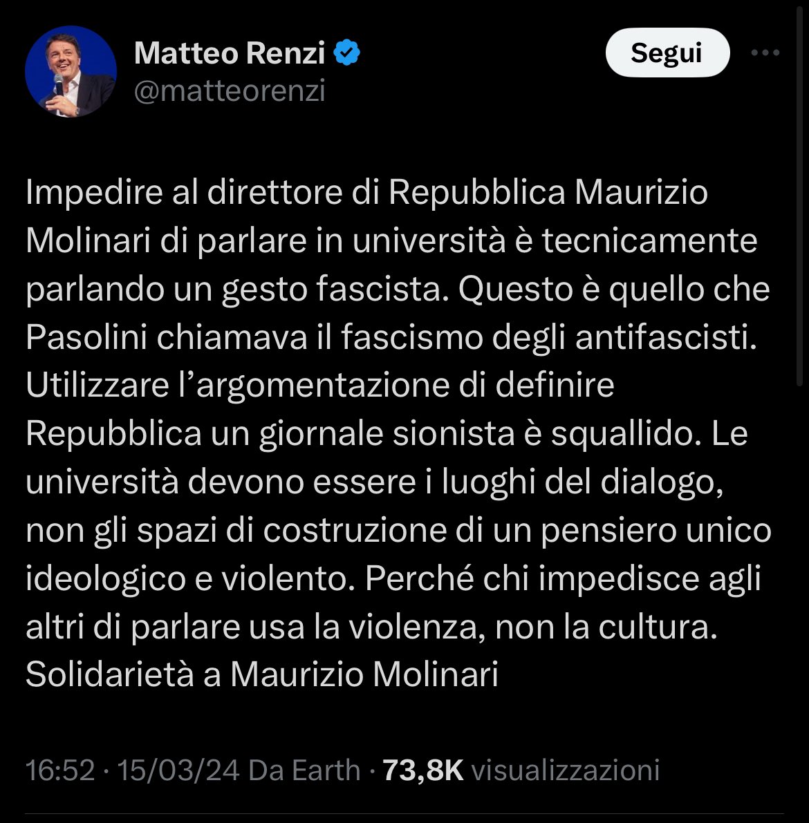 Poi il fedele Filippo, uno che del servilismo ha fatto ragione e metodo di vita, che spiega che è triste e pericoloso non usare i suoi stessi valori e manifestare il dissenso. Ovviamente mettendoci di mezzo la parole d’ordine “antisemitismo”.