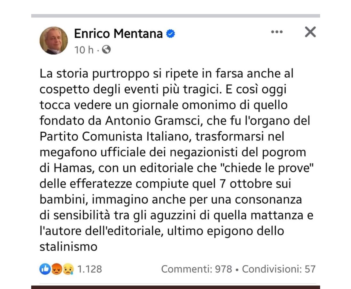 Mentana, subito dopo il 7 ottobre, diceva di avere le foto dei bambini decapitati, ma che chiedere di vederle fosse da “negazionisti di Hamas“