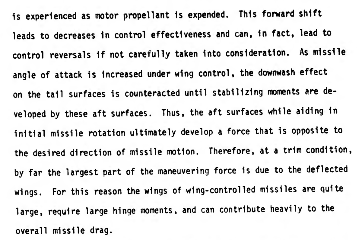 The final point to touch on is the control systems. Wing control, a system used in the Sparrow, is quite reactive to inputs but requires high wing area due to its proximity to the center of gravity of the missile.