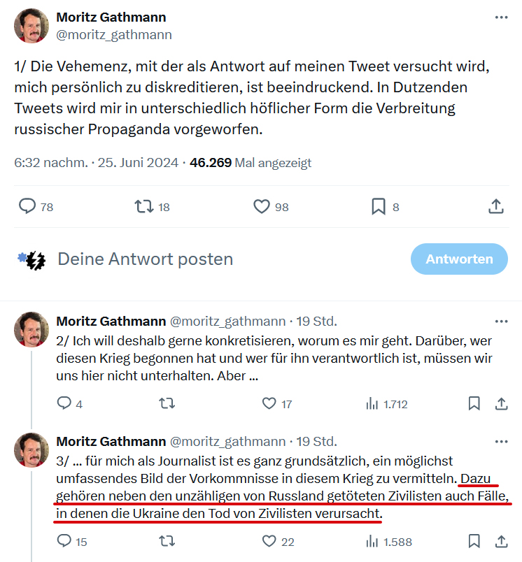 Während in der Ukraine an dem Tag fast 1000 Soldaten gestorben sind und u.a. Odessa bombardiert wurde - wobei mehr Zivilisten gestorben sind als an dem Strand – hält Herr Gathmann es für ausgewogen, auf die toten Russen hinzuweisen und zur Ausgeglichenheit zu mahnen. Sonst würde man sich „angreifbar“ machen.