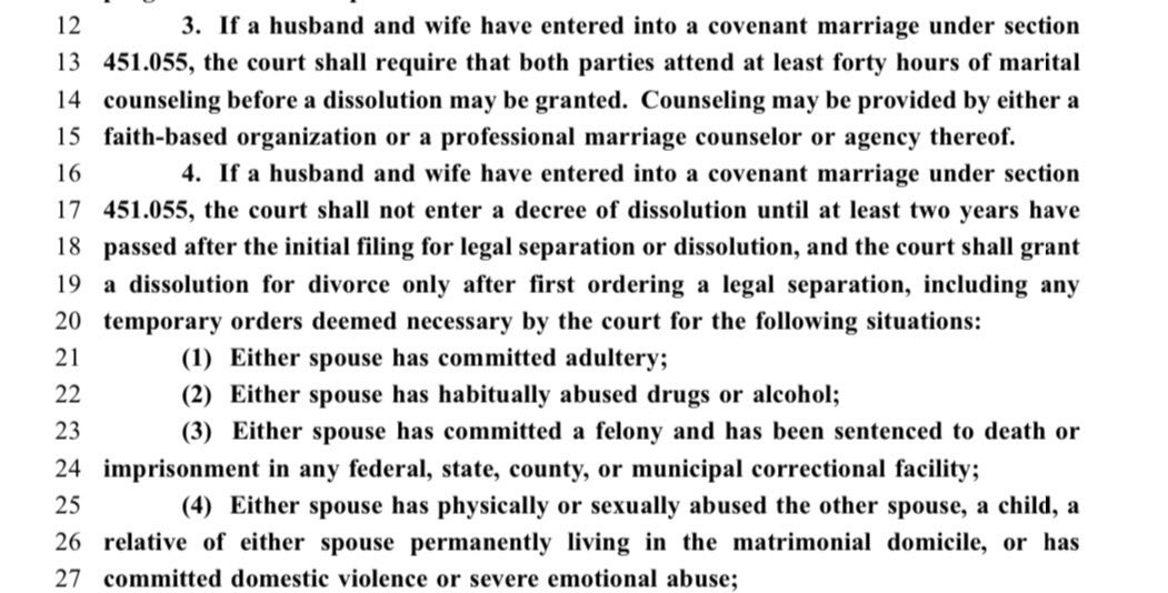 🧵Missouri state rep Mitch Boggs filed a covenant marriage bill for the FOURTH year in a row. #MoLeg #HB1789 is a bill designed to keep women & children in unhealthy & unsafe marriages. The party of freedom & liberty wants to restrict one’s ability to leave a dangerous marriage.