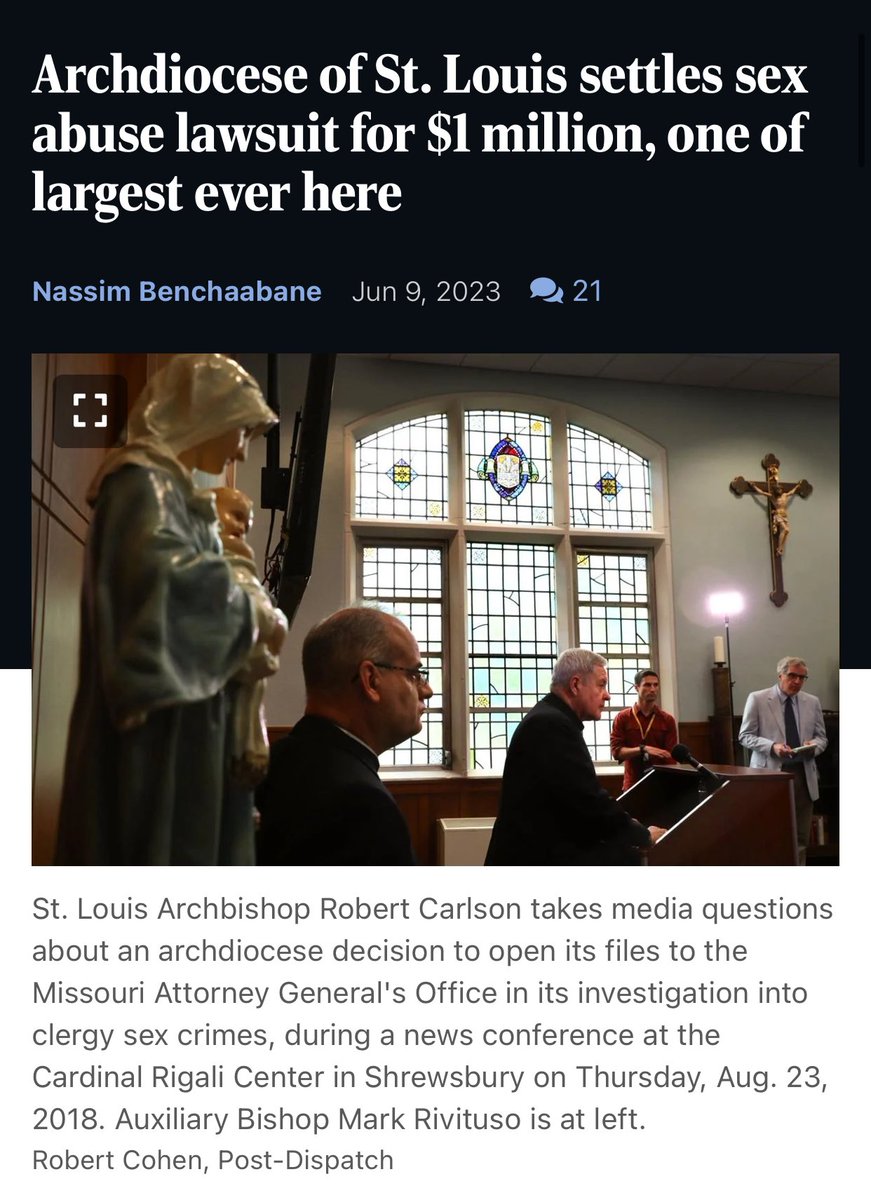 If Ascension Church sounds familiar, it should. The Archdiocese of St. Louis paid out a $1.7 million settlement in 2004 & $1 million settlement in 2023 for the sexual abuse by a priest at Ascension Catholic Church. Same priest both times, different victim. stltoday.com/news/local/met…