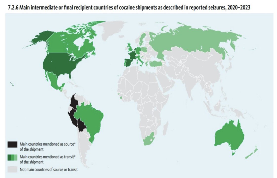 Este mapa de la ONUDD marca tanto los principales países receptores intermedios como finales de los cargamentos de cocaína incautados entre 2020 y 2023. Venezuela no está marcado ni como uno ni como el otro