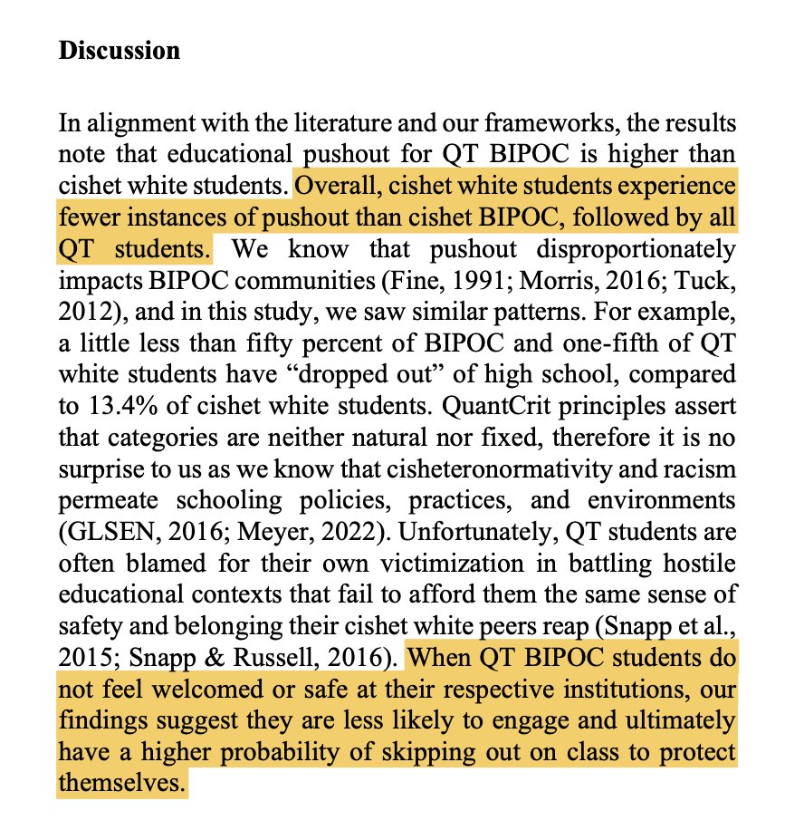 Instead, the authors say that these observed differences must be viewed through "QuantCrit and intersectional theories" that insist the results should be "interpreted as a reflection of how systems of power disproportionately impact QT BIPOC students, resulting in pushout."