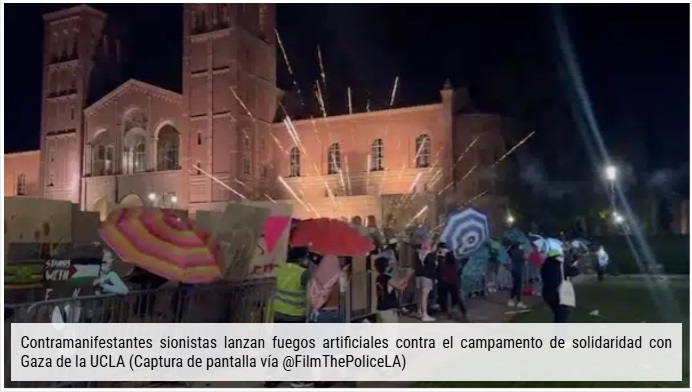 En la Universidad de California en Los Ángeles (UCLA), los contramanifestantes sionistas llevaron a cabo varias rondas de ataques contra el Campamento de Solidaridad con Gaza. +