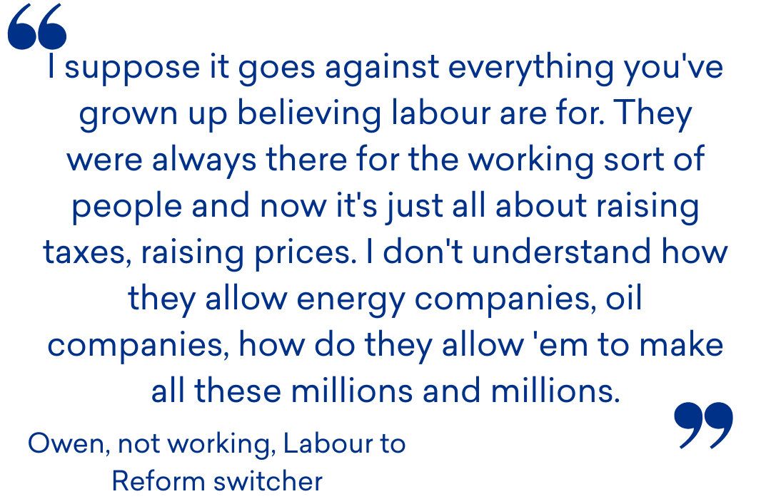 Again that sense that Labour were somehow not for 'working people' anymore and were making the cost of living crisis worse was a driver of frustration for the group - and the sense that the wealthiest were benefiting from it.
