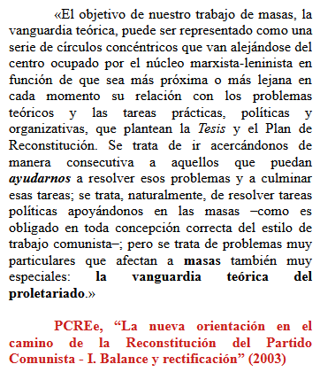 > Vanguardia Práctica, absolutizada por el PCR en la Tesis), debe resolverse aquella entre la VTML y la VT, atendiendo a los problemas que plantea el estado de liquidación ideológica del comunismo. Así, el trabajo de masas de la Reconstitución Ideológica versa sobre la VT: