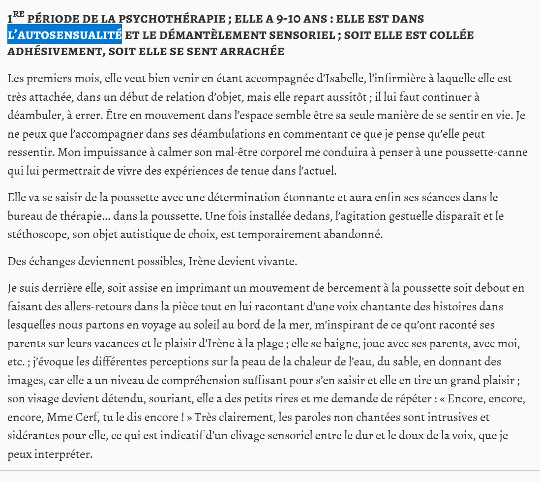 (intermède : à votre avis, si les enfants autistes qui ont subi ces études de cas lisent un jour ces interprétations psychanalytiques pétées de leurs ressentis et de leur rapport aux objets, que vont-ils / elles en penser ?)