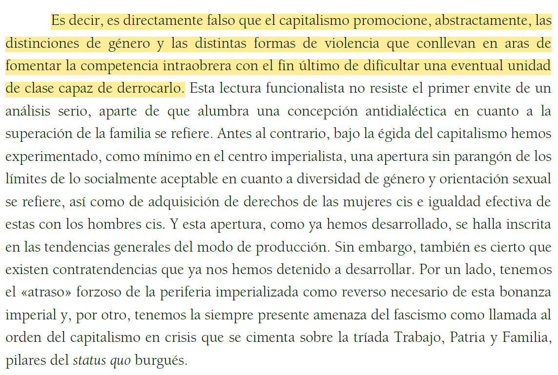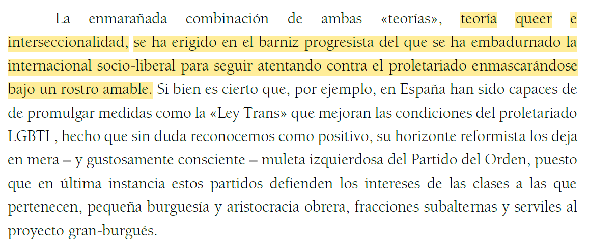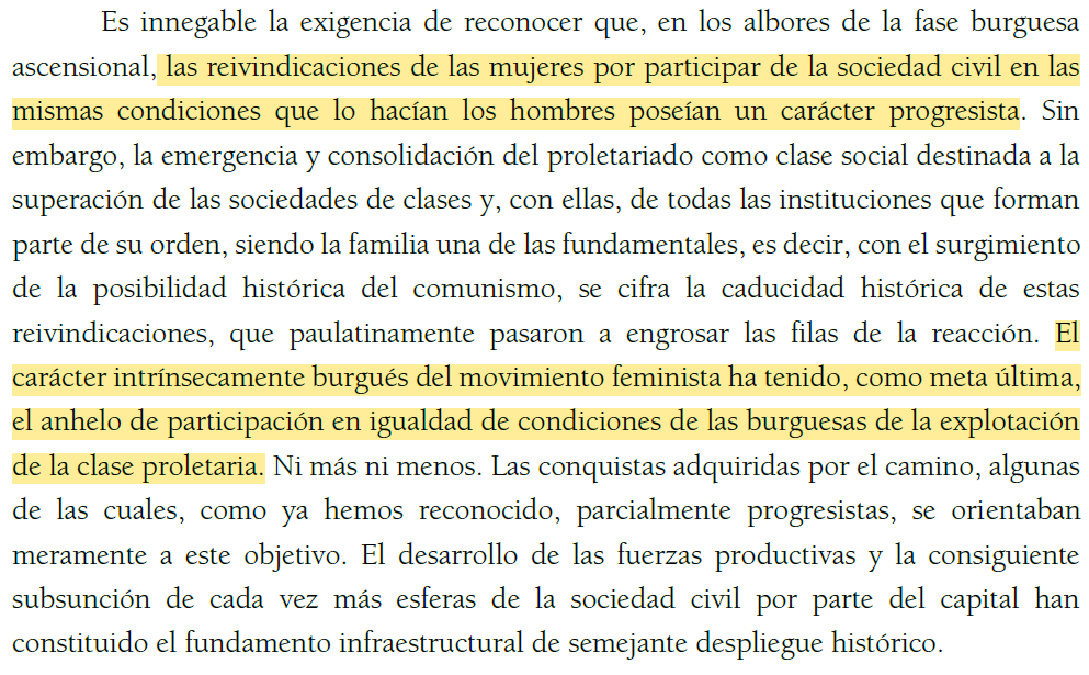 Y es que las organizaciones autodenominadas revolucionarias tienen la necesidad ineludible de combatir el feminismo como ideología del nuevo orden burgués sin renunciar a la pugna por la «emancipación de género» como momento particular de la universalidad del proyecto comunista.