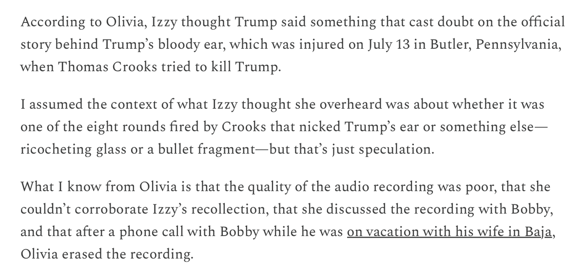 "What I know from Olivia is that the quality of the audio recording was poor, that she couldn’t corroborate Izzy’s recollection, that she discussed the recording with Bobby, and that after a phone call with Bobby while he was on vacation with his wife in Baja, Olivia erased the recording." telos.news/p/part-4-means…