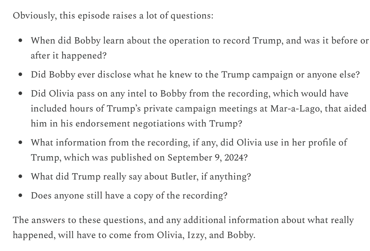 *Did Olivia pass on any intel to Bobby from the recording, which would have included hours of Trump’s private campaign meetings at Mar-a-Lago, that aided him in his endorsement negotiations with Trump?