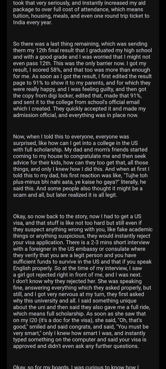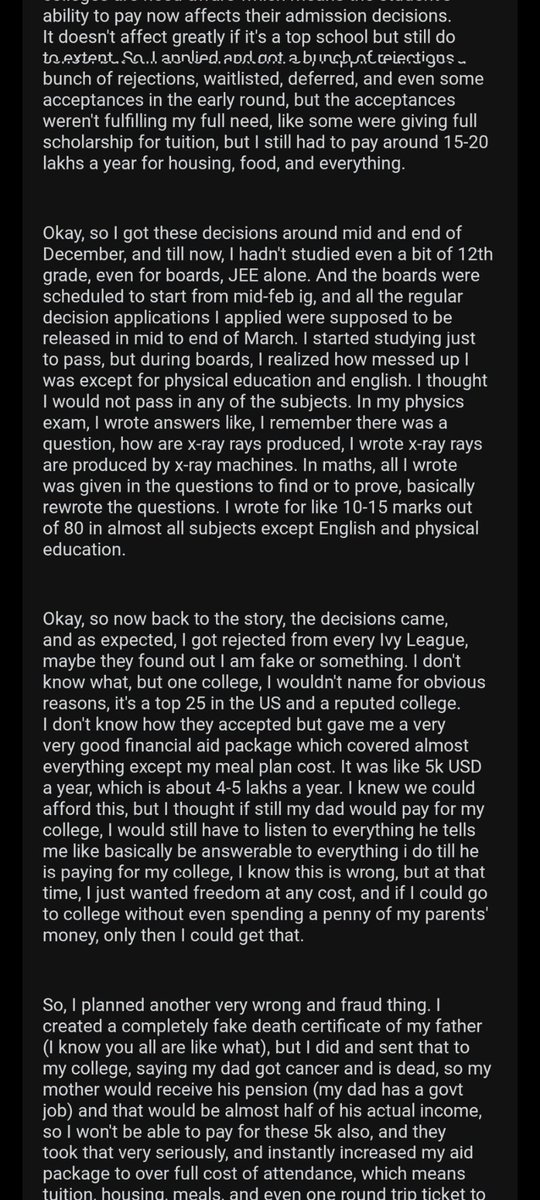 he was granted nearly a full scholarship at a top college but decided it wasn't enough, so he also forged his own father's death certificate and was promptly given a full ride with flights included