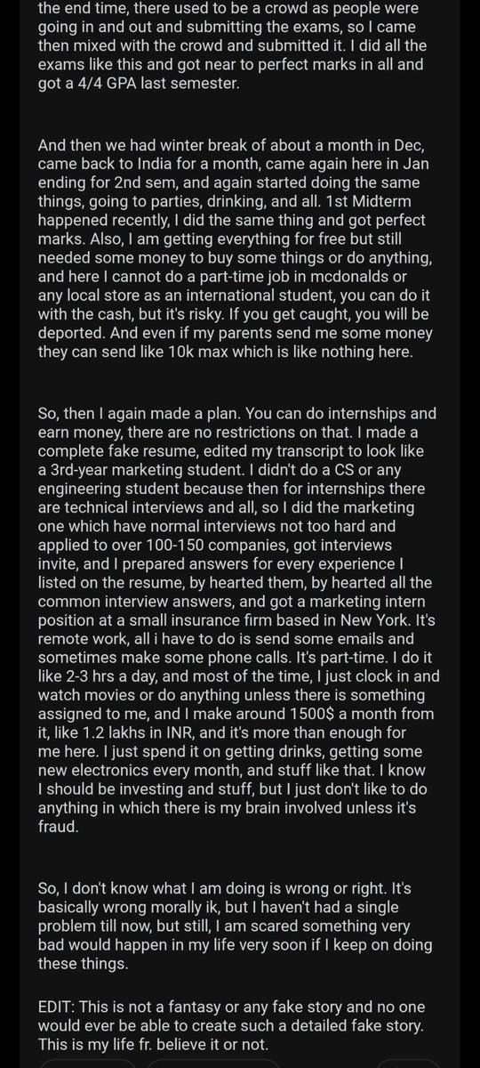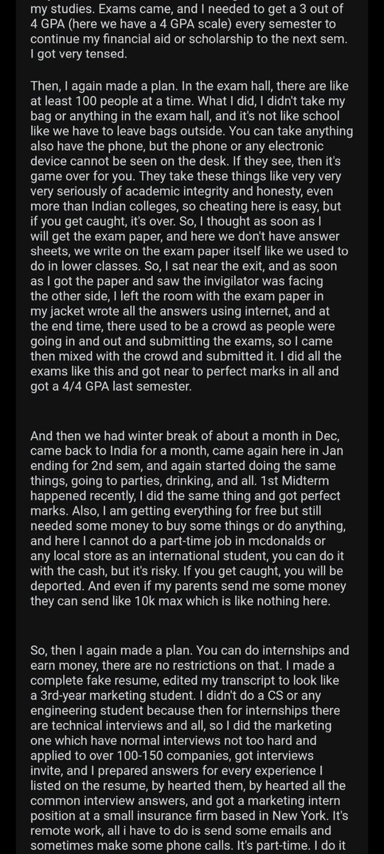 he had literally none of the knowledge required to even graduate high school, so at college he went on to cheat on all exams using internet and then forged a resume with fake work experience to get an internship at an insurance firm