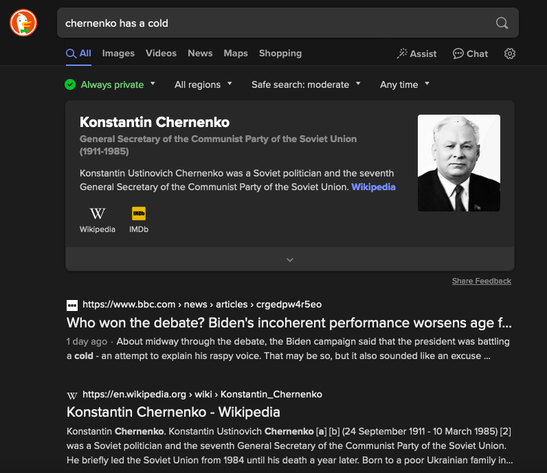 I searched "Chernenko has a cold" to find stories of the Soviet leader who preceded Gorbachev, and this was the search result. duckduckgo.com/?q=chernenko+h…