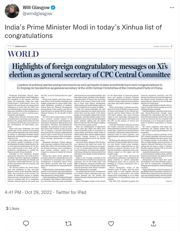 2nd, Will reports India's PM Modi congratulated Xi.
