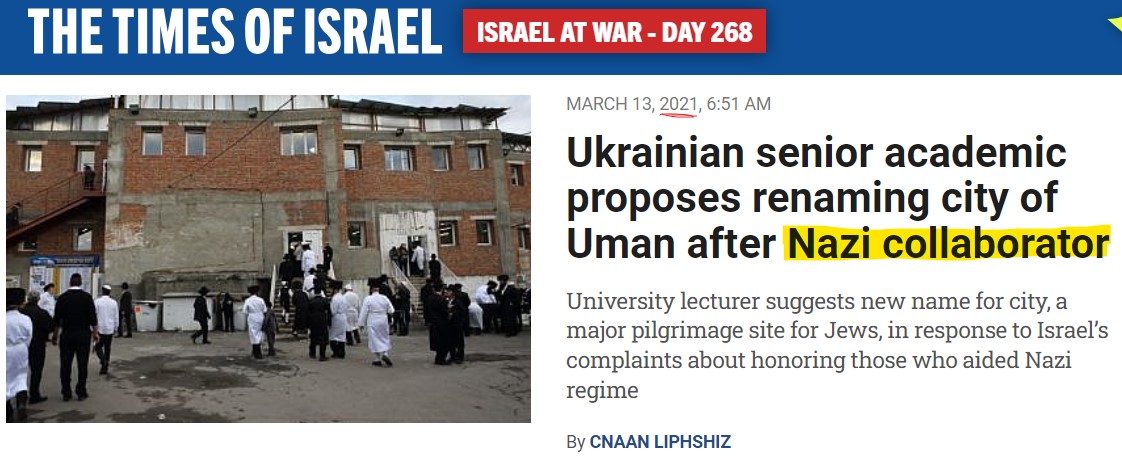 2020: ToI reports Ukraine's Zelensky government told Israel to butt out and stop complaining about Ukraine glorifying Nazi collaborator Stepan Bandera - Stefan Romaniw's hero.