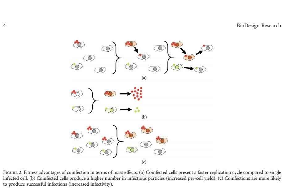 2) Viruses can exhibit a range of cooperative and competitive interactions, which often occur in cells co-infected with multiple viral variants.