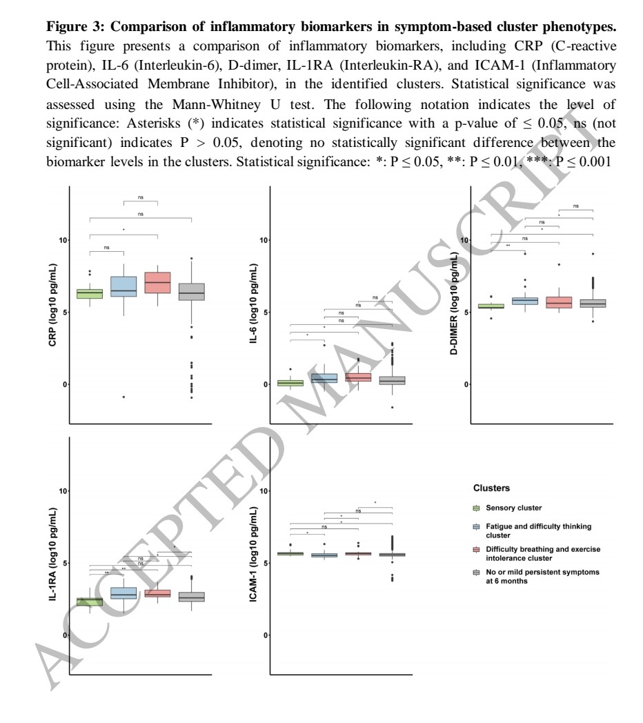 3)...and difficulty breathing/ exercise intolerance. The sensory cluster was associated with outpatient status, while the difficulty breathing cluster had higher obesity rates and hospitalization. Regression analysis linked inflammatory markers to specific symptoms.