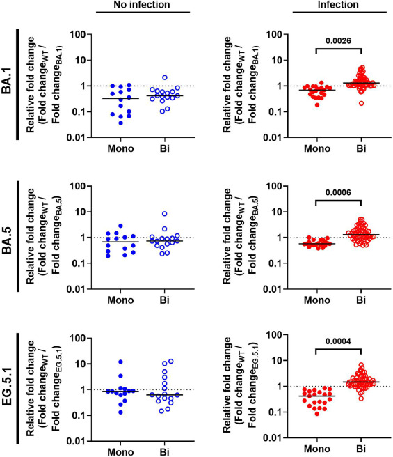 2) Bivalent mRNA boosters induce lower IgA responses against Omicron variants compared to monovalent boosters, but only in previously infected individuals. The relative fold change in IgA is more skewed towards ancestral spike than variant spike in bivalent-boosted ...
