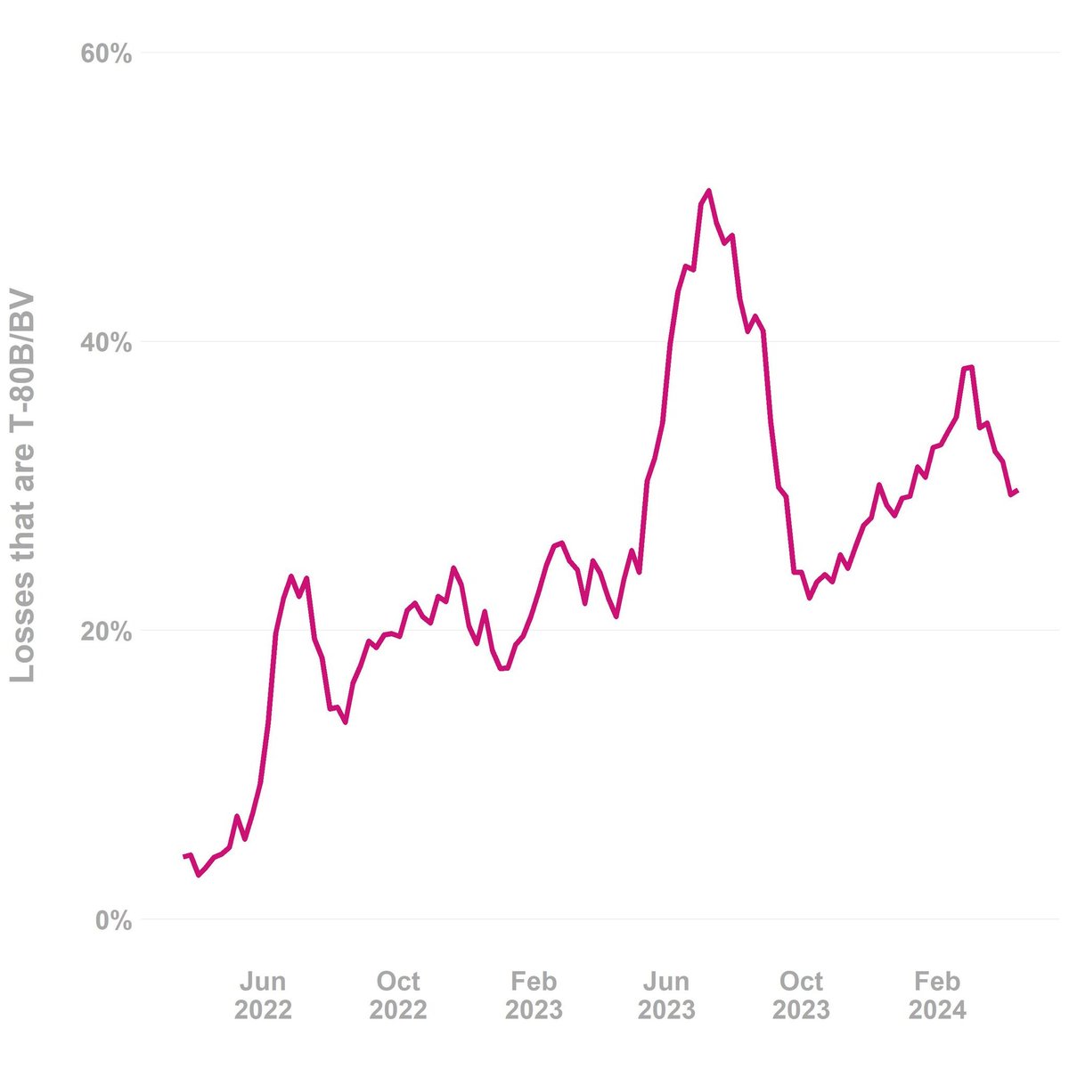 3/ To understand why the T-80B/BV are so important I have asked @whitherapathy to make me a graph of the share of T-80B/BV among the destroyed and captured tanks registered by Oryx. As you can see the type has made up a significant share of the losses since mid 2022.